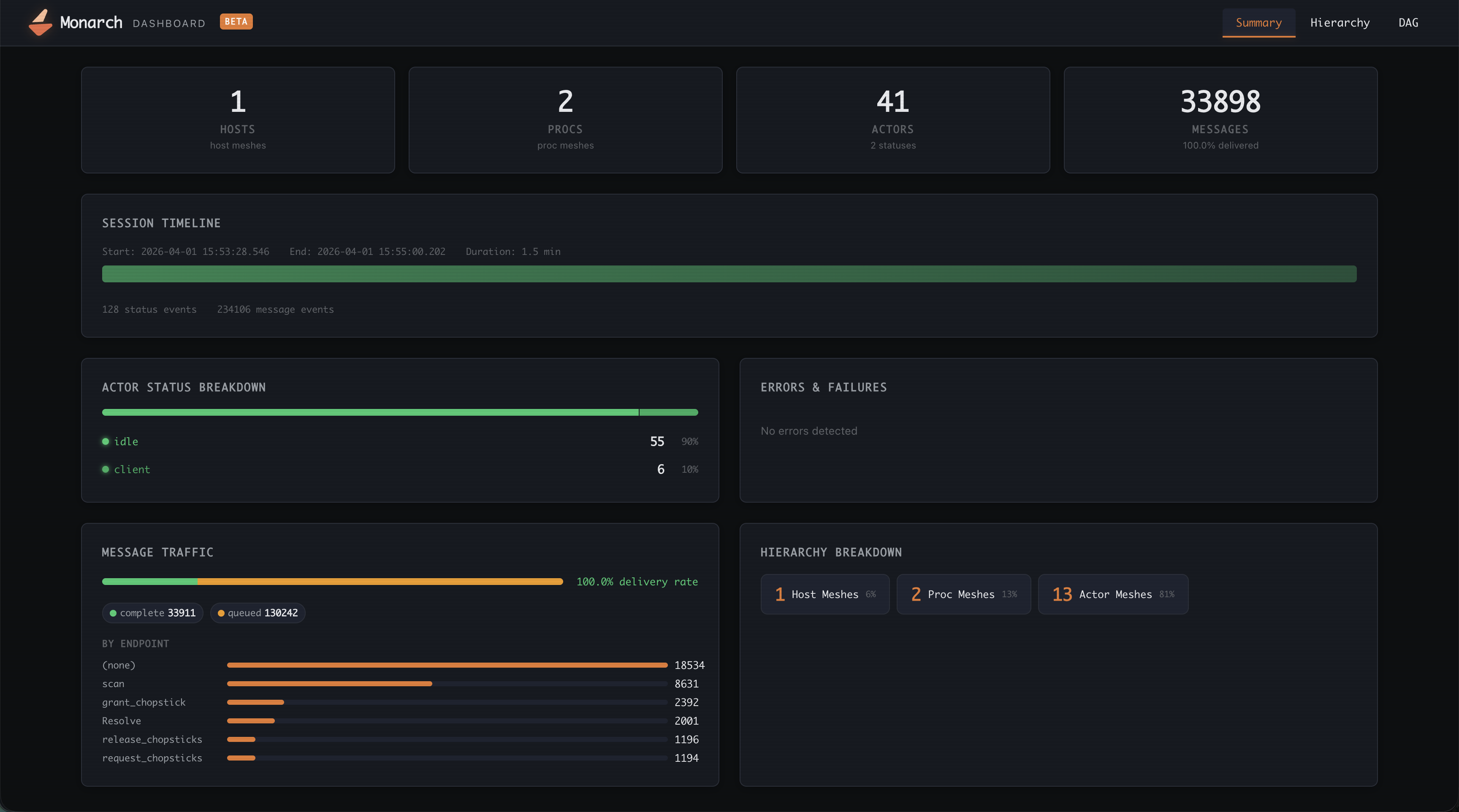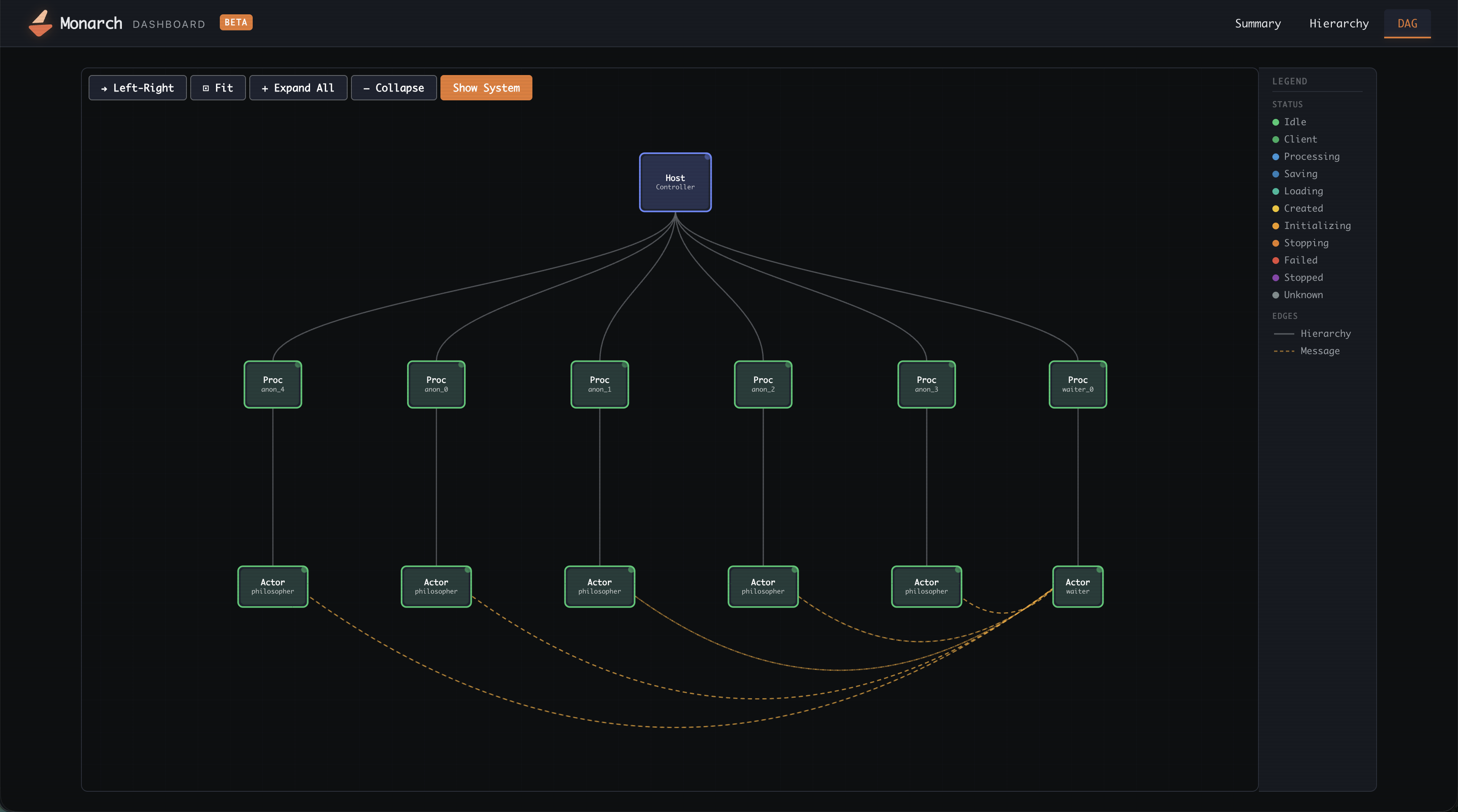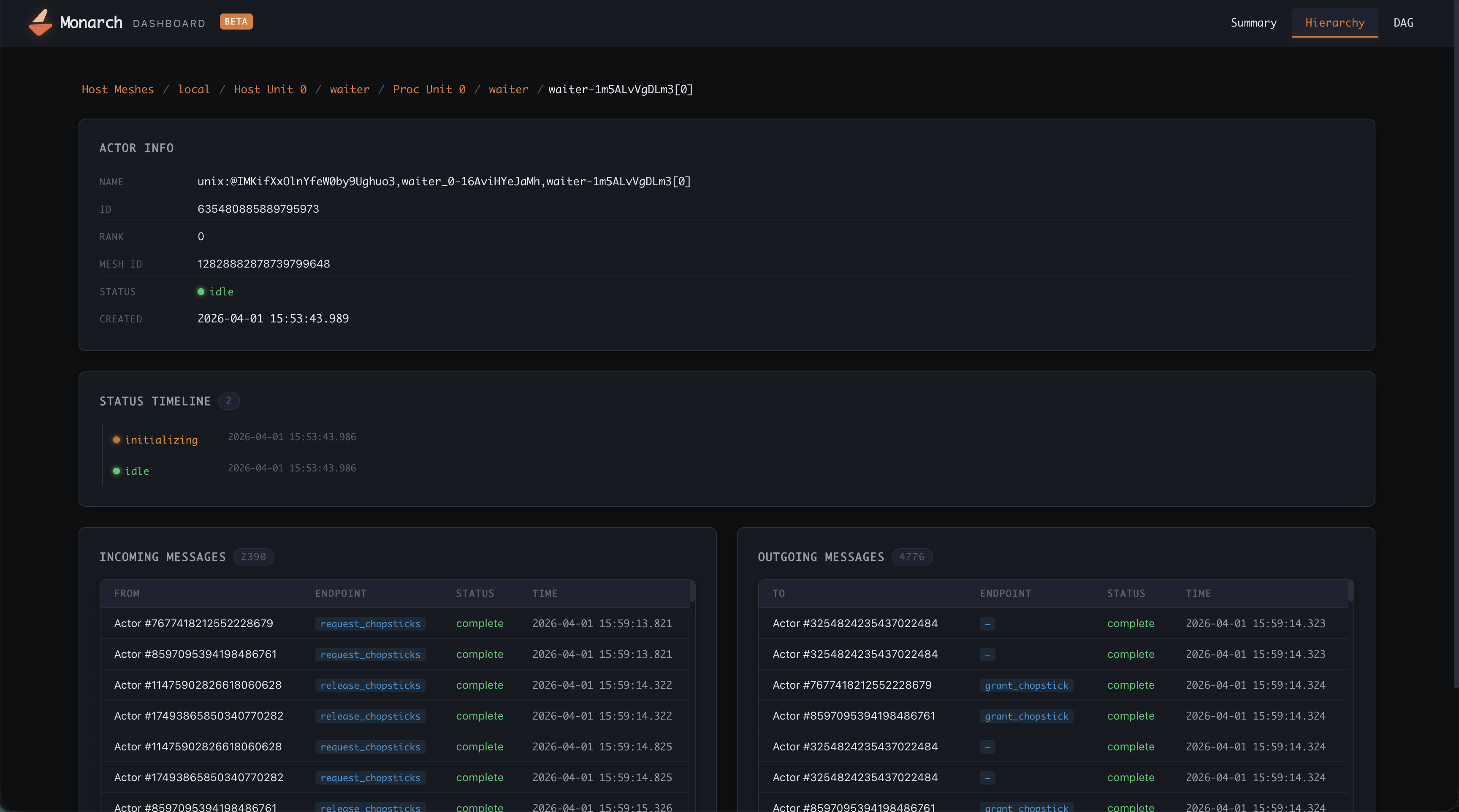 The Monarch Dashboard is a web-based GUI for monitoring Monarch actor systems in real time. It connects to the distributed telemetry system and renders the full mesh topology — hosts, processes, actor meshes, and individual actors — as interactive views with live-updating metrics, message traffic analysis, and a full DAG visualization.
