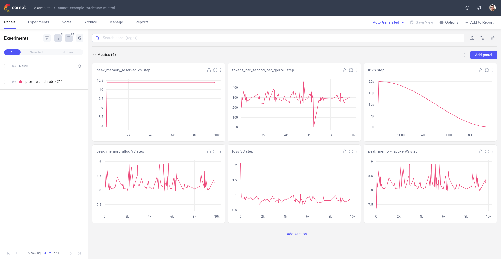 torchtune supports logging your training runs to Comet. An example Comet workspace from a torchtune fine-tuning run can be seen in the screenshot below.